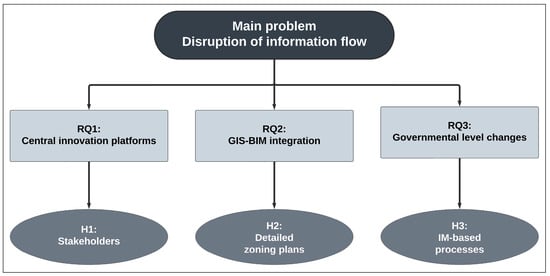 This approach is structured around three key research questions (RQ) and hypotheses (H), which suggest that integrating stakeholders on digital twin platforms, bridging GIS and BIM at the detailed zoning planning stage, and implementing IM-based processes in urban planning and permits will reduce information gaps and enhance data accuracy: