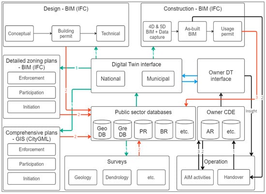 Green and red lines on the figure describe the flow between public sector services and processes, whereas green indicates input from the public sector and red signifies output toward them. Black lines characterize internal movements and interactions between processes and services that might not involve the public sector. Blue lines highlight possible interactions between the owner and the public sector in the DT interface. Numbers on the lines indicate the sequence of information exchange where it is two-directional, and sequence is important.