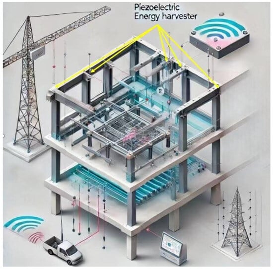 Schematic diagram of the piezoelectric energy harvester arrangement in the structural health monitoring system of a building.