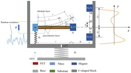 Figure 2 depicts the structural layout of the proposed asymmetric TPVEH + EB. This model features a pair of piezoelectric layers bonded to both sides of a cantilever beam’s metal layer, which is of length l. A tip magnet is fastened at the beam’s free end, with two external magnets asymmetrically positioned on the U-shaped block. The term dh represents the horizontal separation between the tip magnet and the external magnets, while dv1 and dv2 indicate the respective vertical distances. Define as the point where the horizontal projection from the tip magnet intersects the line joining the external magnets, o as the midpoint of this line, and d0 as the distance from o to . EB, consisting of a spring and U-shaped block, is strategically positioned between the asymmetric TPVEH and the elastic base. The mass Mf, situated at the constrained end of the beam, connects to both the beam and the U-shaped block via a vertical spring kf, which enhances the vertical movement of the beam.