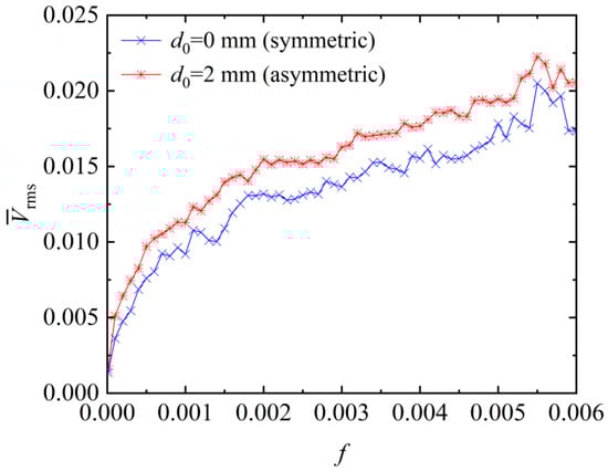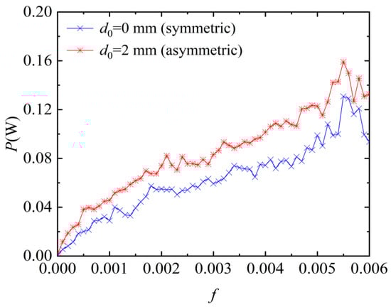 When d0 = 0, the two external magnets are symmetrically arranged, resulting in a symmetric potential well for the system’s tri-stable potential energy function. Conversely, when , the two external magnets are arranged asymmetrically, leading to an asymmetric potential well in the system’s tri-stable potential energy function. Figure 3 illustrates the RMS voltages of the TPVEH + EB system under varying random excitation intensities and different d0 values. A comparative analysis of the RMS voltages indicates that the asymmetric tri-stable system exhibits significantly enhanced capability in harvesting vibrational energy compared to the symmetric tri-stable system. Figure 4 presents the electrical power outputs harvested by the symmetric and asymmetric tri-stable systems under different random excitation intensities. The results clearly demonstrate that the asymmetric tri-stable system achieves significantly higher electrical power output than the symmetric tri-stable system. This performance disparity highlights the superior energy conversion efficiency of the asymmetric TPVEH + EB system. This performance disparity is attributed to the asymmetric potential energy wells, which have lower potential differences and more unstable characteristics compared to their symmetric counterparts, thereby enhancing energy harvesting performance. In both cases, the system reaches its maximum power at around f = 0.0055, which falls within the commonly encountered low-level excitation intensity range in building structures, facilitating the collection of vibrational energy from the structure.