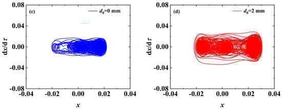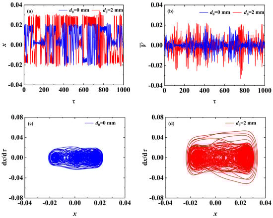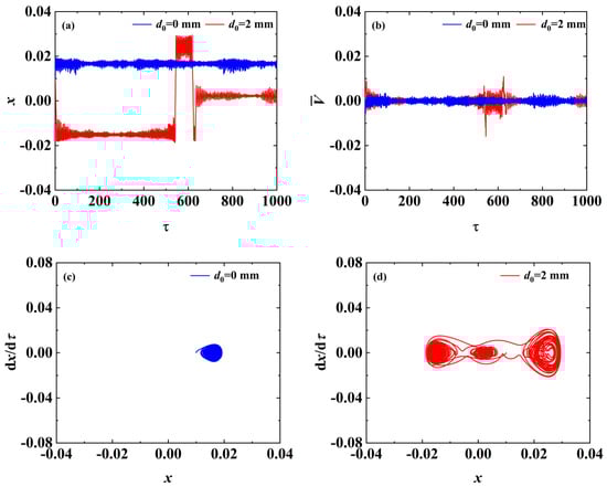 Responses of TPVEH + EB for f = 0.0003: (a) displacement (d0 = 0 mm, d0 = 2 mm), (b) voltage (d0 = 0 mm, d0 = 2 mm), (c) phase portrait (d0 = 0 mm), (d) phase portrait (d0 = 2 mm).