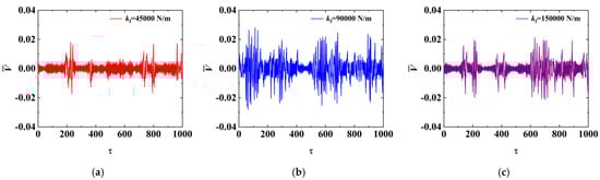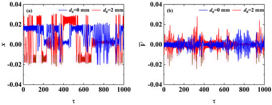 Let , where f is the strength of the random excitation, represents the time interval, and normrnd(1,N) denotes N random numbers following a normal distribution. When the base excitation is modeled as a Gaussian white noise process, i.e., , the dimensionless dynamical equation of the asymmetric TPVEH + EB system under random excitation is expressed as follows: