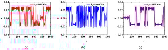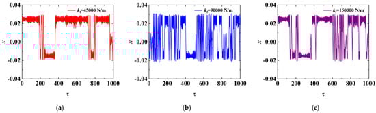 Displacement time–history diagram of asymmetric TPVEH + EB for d0 = 2 mm when (a) kf = 45,000 N/m, (b) kf = 90,000 N/m, (c) kf = 150,000 N/m.