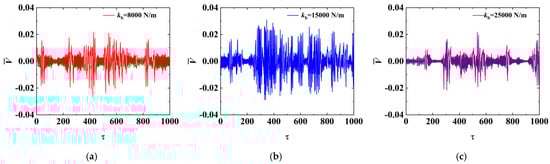 Displacement time–history diagram of asymmetric TPVEH + EB for d0 = 2 mm when (a) kb = 8000 N/m, (b) kb = 15,000 N/m, (c) kb = 25,000 N/m.