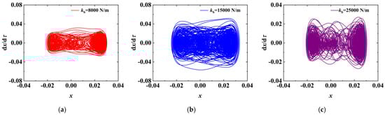 Phase portrait of asymmetric TPVEH + EB for d0 = 2 mm when (a) kb = 8000 N/m, (b) kb = 15,000 N/m, (c) kb = 25,000 N/m.