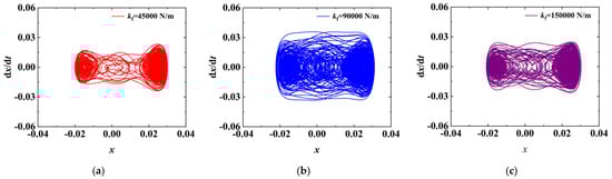 Phase portrait of asymmetric TPVEH + EB for d0 = 2 mm when (a) kf = 45,000 N/m, (b) kf = 90,000 N/m, (c) kf = 150,000 N/m.