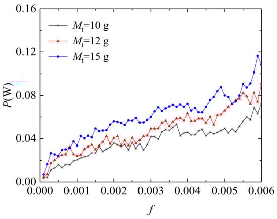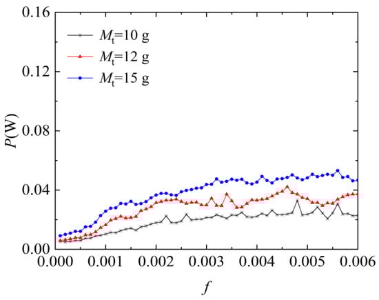 Figure 14 depicts the RMS power of the asymmetric TPVEH + EB (d0 = 2 mm) subjected to different levels of random excitation intensity for various tip magnet masses (Mt) while the spring-mass system mass (Mf) is fixed at 42 g. The data unequivocally demonstrate that increasing the mass of the tip magnet significantly enhances the energy conversion efficiency of the asymmetric TPVEH + EB. Moreover, as illustrated in Figure 15, increasing the mass of the spring-mass system (Mf) to 60 g reveals through comparative analysis that the asymmetric TPVEH + EB system with Mt = 15 g exhibits significantly superior energy conversion efficiency compared to the system with Mt = 10 g. These findings suggest that strategic adjustments to the mass of the tip magnet and the spring-mass system are crucial for maximizing the efficiency of piezoelectric energy harvesting systems, providing valuable insights for their design and optimization in mitigating random vibrations in building structures.
