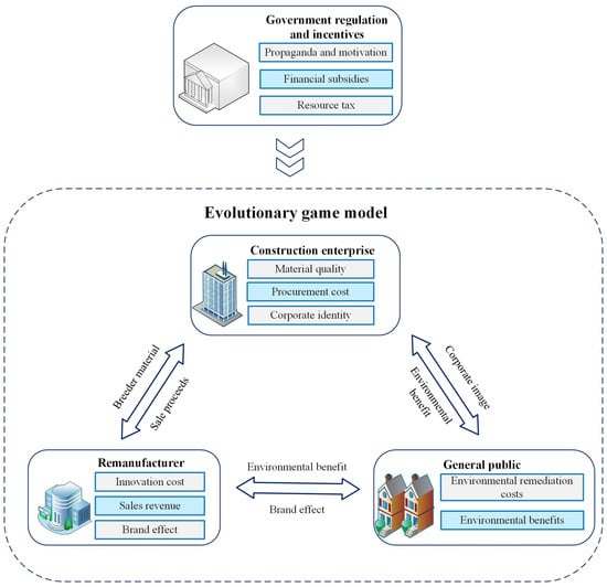 To obtain green value co-creation for CDW resource utilization project stakeholders, the innovative choices of remanufacturers directly affect the quality and price of recycled building materials, thus influencing the choice of materials by construction enterprises. Construction enterprises’ use of materials reflects the market demand for recycled building materials, which in turn influences remanufacturers’ innovative choices. In addition, corporate behavior impacts the environment. The state of the environment influences public environmental governance behavior, which in turn shapes corporate behavior [17]. The decision making processes of remanufacturers, construction enterprises, and the public are interdependent and intertwined. Thus, exploring the evolution of the behaviors of remanufacturers, construction enterprises, and the public within the same framework is analyzing their coevolution, or dynamic interaction [18]. Clarifying the coevolution mechanism among remanufacturers, construction enterprises, and the public in CDW resource utilization projects is essential for facilitating CDW resource utilization [19]. However, the coevolution of remanufacturers, construction enterprises, and the public in CDW resource utilization projects under the green value co-creation perspective has not received enough attention. The evolutionary game approach is suitable for analyzing competition, learning, and adaptation among limited rational subjects and is widely used to study the evolution of stakeholder behavior in CDW resource utilization projects [20]. Therefore, the evolutionary game method can be used to explore the behavioral evolution among the three subjects.
