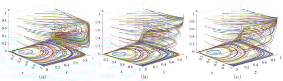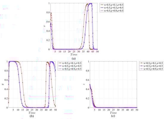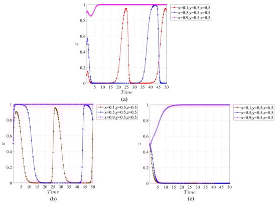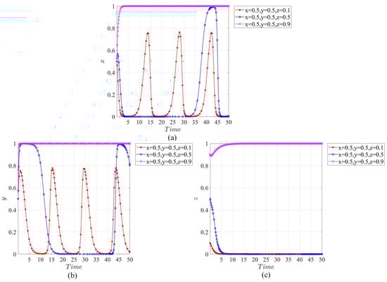 It is supposed that the probability of the remanufacturer choosing independent innovation is x and the probability of imitating innovation is ; the probability of the construction enterprise choosing to use the recycled building materials positively is y and the probability of using the recycled building materials negatively is ; the probability of the public choosing to participate in the environmental governance is z and the probability of not participating in the environmental governance is . Here, x, y, and z are functions of time.