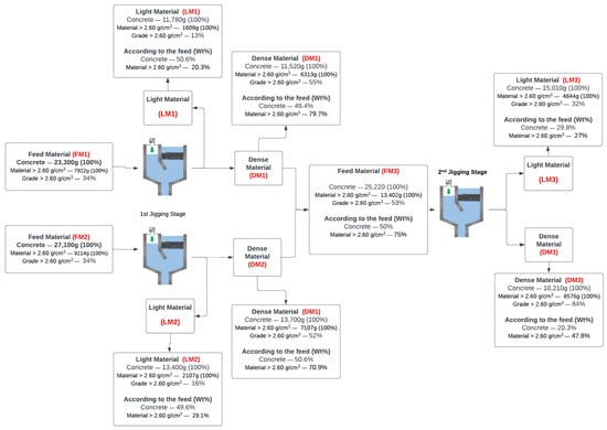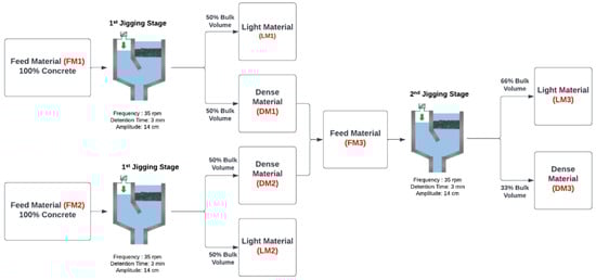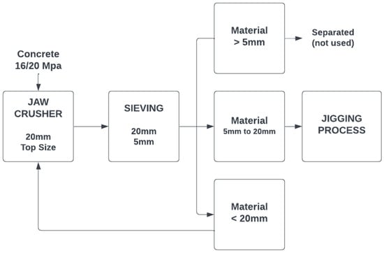 - Gschwenter, V.L.S.; Tubino, R.M.C.; Ambrós, W.M.; Miltzarek, G.L.; Sampaio, C.H.; Moncunill, J.O.; Cazacliu, B.G.; Dal Molin, D.C.C. Production of High-Quality Coarse Recycled Aggregates through a Two-Stage Jigging Process. Minerals 2022, 12, 532. [Google Scholar] [CrossRef]