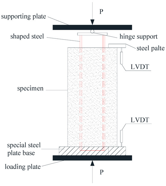 Figure 3 demonstrates the test setup in which the vertical load is applied by the MTS 200 t testing machine. By placing a special steel plate base under the bottom of the specimens and digging an H-type hole in the middle of the special base, it can be ensured that the shaped steel was pushed out from the surrounding matrix. The upper part of the specimen that comes into direct contact with the testing machine is called the loading end, while the lower part is referred to as the free end. During the loading process, the shaped steel at the loading end is under pressure, while the matrix at the free end is compressive, thus achieving the push-out of the shaped steel from the surrounding matrix.