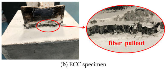 For ordinary concrete specimens, there was no crack in the initial loading process. With the increase in the push-out load, the splitting cracks began to appear in the middle of the flange at the loading end and gradually extended to the free end. Then, with a “bang”, the width and length of the crack increased rapidly. The ordinary concrete specimen underwent a typical brittle splitting failure (see Figure 4a). Figure 5 demonstrates the interface at the free end between the shaped steel and matrix for the ordinary concrete and ECC specimens after the test. In Figure 5a, it can be seen that the concrete at the tip of the flange is crushed. The shaped steel and concrete at the web were obviously detached, resulting in a large gap at the interface.