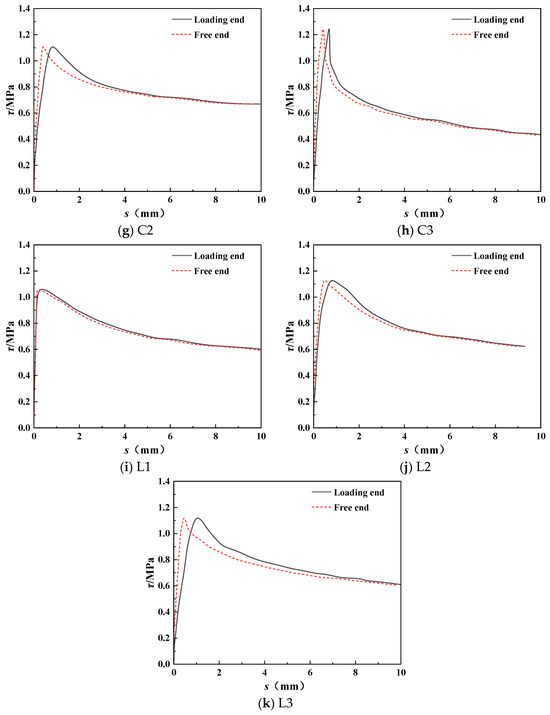 - The bond stress–slip curves consisted of five stages: non-slip, linear ascent, nonlinear ascent, descent, and residual stages. During the initial loading stage, the bond resistance was primarily provided by the chemical adhesive force, with no slip occurring at both ends of the specimen. As the load further increased, the interface chemical adhesive force was destroyed and the bond resistance was mainly provided by sliding friction.