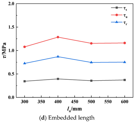 The maximum initial, ultimate, and residual bond strength are observed when the embedded length of the shaped steel is 400 mm, as depicted in Figure 7d. When the embedded length of the shaped steel exceeded 400 mm, there was a gradual decrease in both ultimate and residual bond strength, which tended to stabilize with a further increase in embedded length.