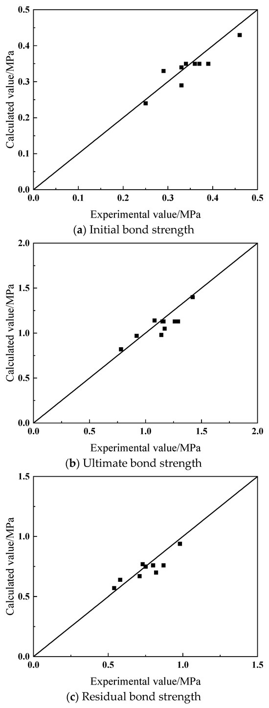 Table 5 summarizes the characteristic points of the bond stress–slip curve for all specimens. Based on the calculation of Equation (2), the standard ultimate bond strengths of specimens S1 and CC1 were 0.17 and 0.13 MPa, respectively, and the standard residual bond strengths were 0.12 and 0.09 MPa, respectively.