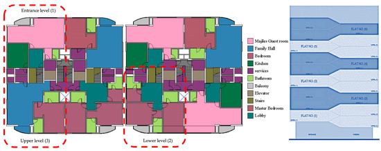 The ground floor of this vertical building is allocated for only entrances and car parking. To more resemble the ‘house’, each apartment is divided into three levels (Figure 2). The entrance level contains the male guest room (majlis), a dining room, a kitchen, a storage area, and a guest toilet. The upper level includes a master bedroom, a family living room, a kitchenette, and toilets. The lower level consists of two bedrooms with attached bathrooms, a maid’s room with a toilet, and a laundry room.