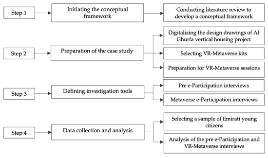 In the first step, a conceptual framework was established based on reviewing literature related to the principles of social sustainability in vertical housing design. In the second step, the selected ‘professional’ design of the Al Ghurfa vertical public housing project was ‘digitally’ prepared to be ready for the following investigation steps. While in the third step, the VR-Metaverse tools of the in-depth interviews before and during the e-Participatory sessions were defined. The last step was data collection through these defined investigative tools, which was followed by the analysis and discussion of the collected data. The following sub-sections summarize these steps.