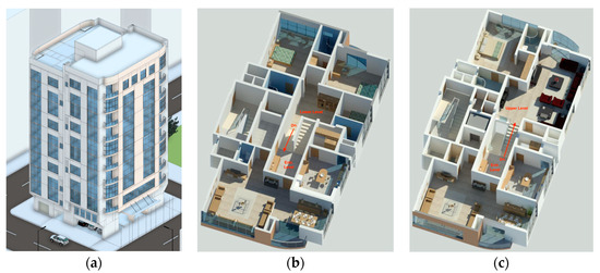 Digitalized design of Al Ghurfa vertical housing project: (a) showing 3D BIM model for the whole building (b) showing a section view for the unit’s entrance level with the upper level, and (c) showing section view of the unit’s entrance level with the lower level (source: the authors).