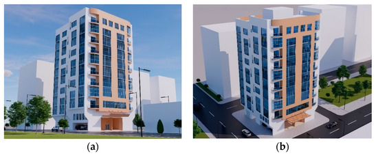 VR-ready perspective views for the Al Ghurfa vertical housing project: (a) human eye perspective view: (b) bird’s eye perspective view (source: the authors).
