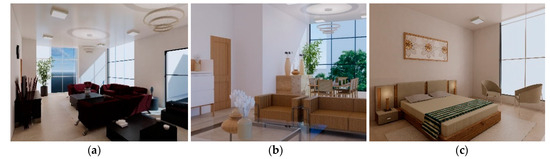 Examples of the scale 1:1 ‘virtual’ interior spaces for a typical housing unit in the Al Ghurfa vertical housing project: (a) majles room, (b) family living room, and (c) the master bedroom (source: the authors).