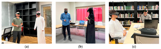 The VR-Metaverse e-Participation interviews; (a) interviewing a staff member, (b) interviewing a female senior student, and (c) interviewing a male senior student (source: the authors).