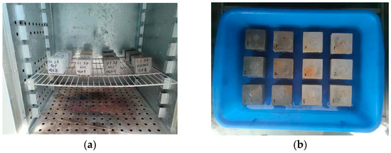 Treatment of water absorption test specimens. (a) Drying of cement mortar specimens; (b) Immersion of cement mortar specimens.