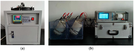 Apparatus for the chloride ion penetration resistance test of cement mortar. (a) Vacuum saturation apparatus; (b) RCM testing instrument.