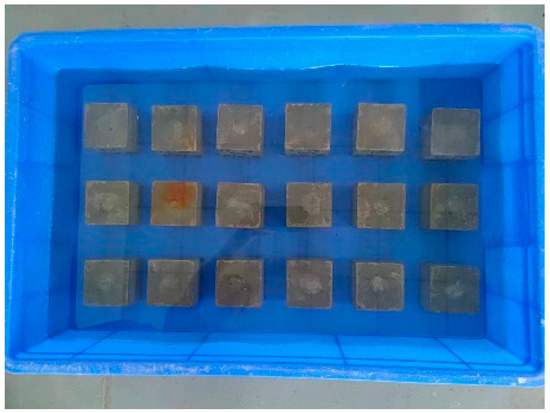 The water absorption test of cement mortar was conducted in accordance with the relevant provisions of the Chinese standard “Standard for Test Method of Basic Properties of Construction Mortar” [31]. The water absorption test specimens were cubes with dimensions of 70.7 mm × 70.7 mm × 70.7 mm, with three specimens per group, as shown in Figure 4.