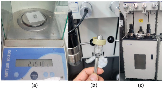 The MIP test samples were cement mortar specimens with dimensions of 10 mm × 10 mm × 10 mm. After curing for 28 days, the specimens were removed and immersed in anhydrous ethanol to halt hydration. One day prior to the experiment, the specimens were taken out, dried, and tested using a mercury porosimeter, as shown in Figure 7.