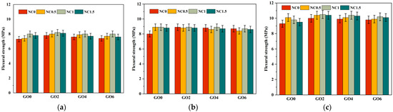Combining Figure 8 and Figure 9, it could be observed that the mechanical enhancement effect of the composite GO and NC group was generally higher than that of the single GO group and the NC group. In addition, the optimal GO dosage for the flexural strength of cement mortar in the single GO group was 0.02 wt%, the optimal NC dosage for the flexural strength of cement mortar in the single NC group was 1 wt%, and the optimal GO dosage and NC dosage for the flexural strength of cement mortar in the composite GO and NC group were 0.02 wt% and 1 wt%, respectively.