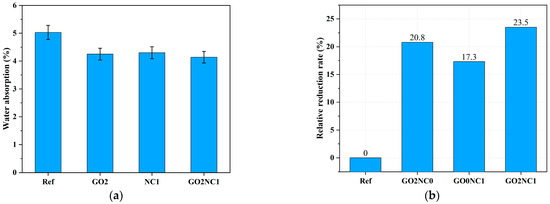 As shown in Figure 10, the addition of GO and NC significantly reduced the water absorption of cement mortar. The water absorption of the Ref group was 4%, while the GO2NC0 group exhibited a water absorption of 3.17%, representing a decrease of 20.8% compared to the Ref group. The GO0NC1 group showed a water absorption of 3.31%, reflecting a decrease of 17.3% compared to the Ref group. The GO2NC1 group exhibited a water absorption of 3.06%, indicating a decrease of 23.5% compared to the Ref group. It can be seen that the combined addition of GO and NC yielded better results compared to the GO2NC0 and GO0NC1 groups. Specifically, the relative reduction rate of water absorption in the GO0NC1 group was 2.75% higher than that of the GO2NC0 group and 6.3% higher than that of the GO0NC1 group.