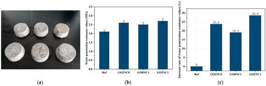 As shown in Figure 11, the addition of GO and NC significantly enhanced the water penetration resistance of cement mortar. The water penetration resistance value of the Ref group was 2.1 MPa, while the GO2NC0 group demonstrated a water penetration resistance value of 2.6 MPa. Compared to the Ref group, the GO2NC0 group increased by 23.8%. The increased rate of the GO0NC1 group was 19.1%. The GO2NC1 group had the largest rate increase of 28.6%. It can be observed that the combined addition of GO and NC yielded better results compared to the GO2NC0 and GO0NC1 groups. Specifically, the increased rate of water penetration resistance values in the GO2NC1 group was 4.8% higher than that of the GO2NC0 group and 9.5% higher than that of the GO0NC1 group.