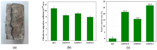 As shown in Figure 12, the addition of GO and NC significantly enhanced the chloride ion penetration resistance of cement mortar. The chloride ion migration coefficient of the Ref group was 10.78 × 10−12 m2/s, while the GO2NC0 group demonstrated a chloride ion migration coefficient of 8.46 × 10−12 m2/s. Compared to the Ref group, the GO2NC0 group decreased by 21.5%. The GO0NC1 group exhibited a chloride ion migration coefficient of 9.08 × 10−12 m2/s, reflecting a decrease of 15.8% compared to the Ref group, which validated the experimental findings of Chen et al. [28]. The GO2NC1 group showed a chloride ion migration coefficient of 7.89 × 10−12 m2/s, indicative of a decrease of 26.8% compared to the Ref group. It can be observed that the combined addition of GO and NC yielded better results compared to the GO2NC0 and GO0NC1 groups. Specifically, the relative reduction rate of the chloride ion migration coefficient in the GO2NC1 group was 5.3% higher than that of the GO2NC0 group and 11.04% higher than that of the GO0NC1 group.