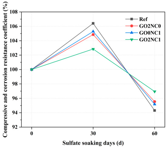 During the immersion period of 30–60 days, the compressive corrosion resistance coefficients of all the groups started to decrease. Among them, the compressive corrosion resistance coefficient of the Ref group decreased the most, reaching 94.3% at 60 days. This was mainly due to the continuous formation of ettringite, which led to the expansion of the filled pores and the formation of more cracks, ultimately resulting in a decrease in strength. The GO2NC1 group exhibited the highest compressive corrosion resistance coefficient at 60 days, reaching 97.0%. The GO2NC0 and GO0NC1 groups exhibited compressive corrosion resistance coefficients between the Ref group and the GO2NC1 group. This was because the filling effect of GO and NC filled the pores, improving the pore structure and compactness inside the hydration products, thereby enhancing the resistance of cement mortar to sulfate erosion.