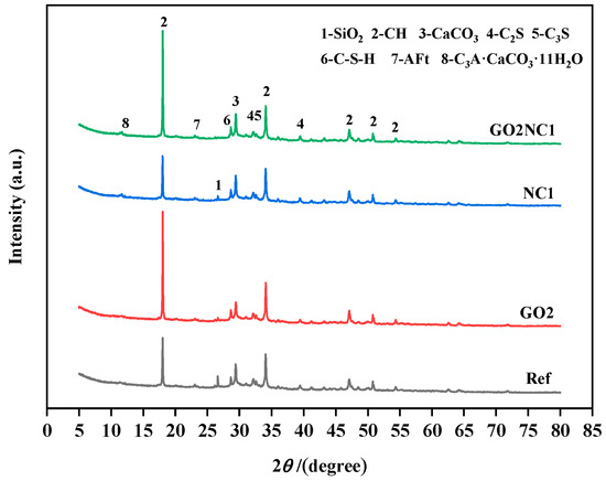 - XRD analysis showed that the nucleation effect of GO and NC caused Ca+ and OH− in the hydration products to be quickly absorbed. However, GO only changed the quantity of hydration products. The reason for the appearance of new hydration products was that NC reacted with tricalcium aluminate (C3A) to generate new hydration products, i.e., calcium aluminate hydrate;