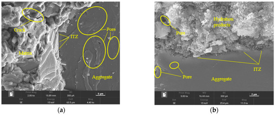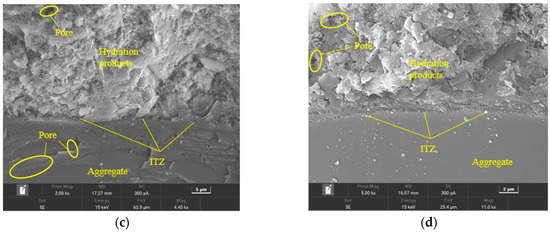 As shown in Figure 15, it was evident that the interfacial transition zone (ITZ) gaps in the Ref group were larger, indicating a less tight connection between the cement hydration products and aggregates, along with some wrinkling and unevenness in the aggregates. Additionally, there were numerous pores and cracks present in the hydration products. In comparison to the Ref group, the GO2NC0 group exhibited a denser arrangement of hydration products and a tighter connection with the aggregates, resulting in smoother and more consistent aggregates, as well as fewer pores in the hydration products. The ITZ in the GO0NC1 group was also denser compared to the Ref group, with more compact hydration products and a relatively lower number of pores in the hydration products. However, the aggregates in this group still displayed some wrinkling and unevenness. The ITZ in the GO2NC1 group showed minimal gaps, representing the most compact connection between hydration products and aggregates, resulting in smoother and more uniform aggregates, as well as relatively fewer pores in the hydration products. Microscopic analysis indicated that the addition of GO or NC was beneficial for improving the ITZ of cement mortar, enhancing bonding strength, and, ultimately, improving the mechanical properties of cement mortar.