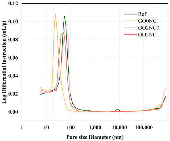 As shown in Figure 16, the GO2NC1 group slightly increased compared to the Ref group. This could be attributed to the addition of GO and NC, which increased the proportion of small pores and decreased the proportion of large pores, ultimately leading to an increase in the total porosity. In accordance with the size of pores in cement-based materials, the pore structure can be classified into four categories: harmless pores (≤20 nm), slightly harmful pores (20~50 nm), harmful pores (50~200 nm), and highly harmful pores (≥200 nm). When GO and NC were added to the mortar separately, GO effectively filled harmful pores due to its small particle size, resulting in a 4.8% reduction compared to the Ref group. However, the lack of synergistic dispersion with NC led to the agglomeration of some GO, resulting in no reduction in the number of highly harmful pores. The addition of NC resulted in a highly effective pore-filling effect, shifting the peak of the MIP test curve to 23.4 nm (compared to 55.8 nm for the Ref group) and reducing harmful pores to the lowest level of 18.5% among all specimens. Unfortunately, due to its slightly larger particle size compared to GO, NC did not significantly control harmless pores.