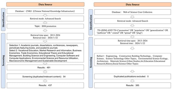 This article employs a research method based on bibliometrics to conduct a literature review, ensuring the collection of a wide range of accurate literature and a rigorous and reliable analysis process. The study selected the CNKI (China National Knowledge Infrastructure) and Web of Science Core Collection as the primary sources of literature, as these two databases provide rich academic resources. In the search using CNKI, we used an advanced search strategy with “BIM software promotion” as the core keyword, covering various fields such as vocational education, market research, business economics, and architectural science and engineering. The search period ranged from 2013 to 2024, resulting in an initial retrieval of 491 articles. After meticulous data cleaning, deduplication, and preprocessing, we selected 437 articles for further in-depth analysis. The search using CNKI was completed on 22 January 2024. For the search using the Web of Science Core Collection, we utilized a comprehensive search expression combining “BIM” and related English synonyms such as “promotion” and “popularize” to enhance the comprehensiveness of the search. The search fields included engineering, architectural technology, computer science, etc., with the time span also set from 2013 to 2024. We retrieved 385 articles, and, after data cleaning and preprocessing, all the literature met the criteria with no invalid or irrelevant articles. Hence, all of the selected literature was included in the final analysis. The detailed steps and process of literature retrieval are shown in Figure 1. Through this systematic and scientific literature review method, we have laid a solid foundation for the depth and breadth of the research, ensuring the accuracy of the analysis and the depth of the discussion.