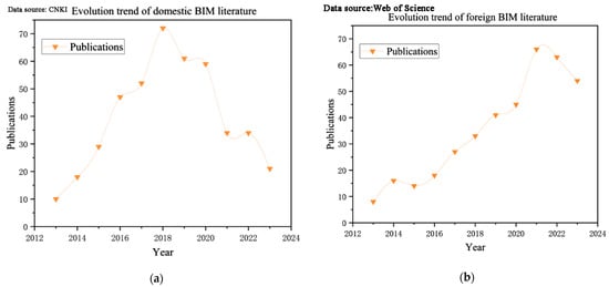 Figure 3a,b clearly depicts the annual trends in the number of publications in the field of BIM. From 2013 to 2018, the number of BIM-related publications on CNKI steadily increased in China, reaching a peak in 2018. However, since 2018, there has been a downward trend in the number of publications, decreasing to six articles by 2023. This technology has become oversaturated in China, leading to a phenomenon where scholars no longer invest as much effort into related research. This trend may indicate that BIM technology research in China is facing new challenges and transformations. In contrast, the Web of Science database shows that, internationally, the number of BIM-related publications steadily increased from 2013 to 2021, peaking in 2021. Although there has been a slight decrease afterward, the number still remains at a high level.