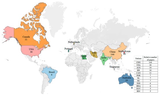 In the 2010s, BIM technology saw widespread application globally. It was especially active in Europe and North America, with the U.S. driven by market demand and industry associations, while the U.K. promoted BIM through mandatory government requirements. Nordic countries also made significant progress in BIM adoption []. In Asia, countries such as China, Japan, and South Korea have actively applied BIM technology. As shown in Figure 4, China leads in the number of publications. This is partly because China’s technological development has not yet reached the industrial production stage, and BIM technology remains in the research phase, resulting in a higher volume of publications. Other regions, such as Australia, New Zealand, the Middle East, and Africa, are also experiencing rapid growth in BIM applications. As an advanced tool for building design, construction, and management [], BIM technology is rapidly developing on a global scale.