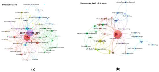 As shown in Figure 5a,b, the co-occurrence network analysis of keywords reveals the focus of BIM research in China, which mainly centers around the profound impact of BIM technology on the construction industry and construction companies. Common research methods include structural equation modeling and interpretive structural modeling. Research in other countries covers various aspects such as design optimization, green building, and information management.