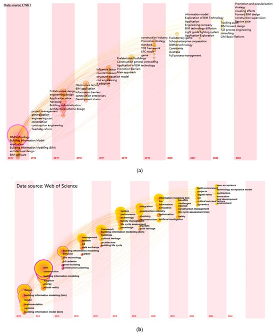 (a) Time Zone Chart of BIM Keywords Evolution in CNKI. (b) Time Zone Chart of BIM Keywords Evolution in Web of Science.