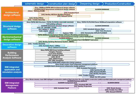The BIM software ecosystem panorama shown in Figure 8 illustrates the current status and future directions of global BIM software in different application stages and fields. This provides a macroscopic perspective and strategic planning for the development of Chinese BIM software, aiding in the comprehensive advancement of Chinese BIM software in areas such as technological research and development, market promotion, and industry applications.