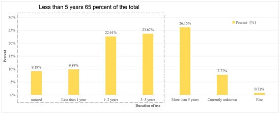 As shown in Figure 9, the application life of BIM software in China is relatively short. 26.15% of enterprises have used Chinese BIM software for more than 5 years, while the majority of enterprises have used it for less than 5 years. Specifically, 23.67% of companies have used it for three to five years, and 22.61% have used it for one to two years. 9.19% of the units have not yet used Chinese BIM software [], and 9.89% of the units have been in use for less than 1 year [].