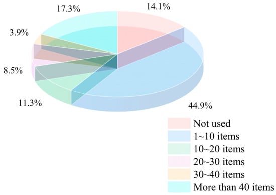 As shown in Figure 10, in terms of the number of application projects, 44.88% of the units use Chinese BIM software to complete projects between 1 and 10, 14.13% of the units have not yet applied projects, 11.31% of the units have applied projects between 10 and 20, and 8.48% of the units have applied projects between 20 and 30. 3.89% of the units are between 30 and 40 items, and 17.31% of the units are more than 40 items [,].
