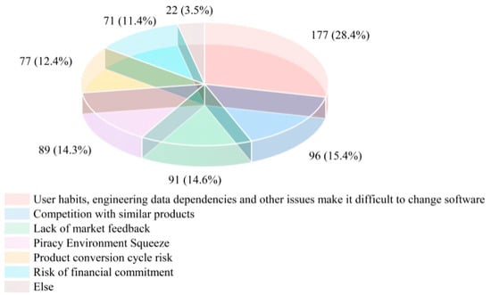 The survey results further indicate that government agencies, design firms, and construction enterprises are the main driving forces behind the development and application of BIM software in China, accounting for 27.78%, 24.07%, and 18.52% of the surveyed entities, respectively, as shown in Figure 12. The survey focuses on policy guidance, market application management, government support, and ecosystem cultivation. In general, enhancing user awareness of Chinese BIM software [,], optimizing the software user experience, strengthening market feedback mechanisms, and increasing policy support are key pathways to promote the development of BIM software in China [,].
