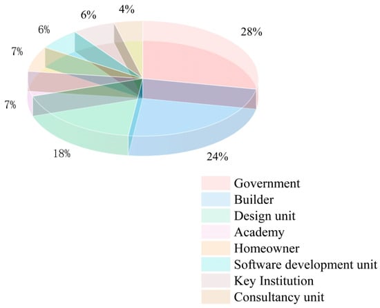 Among these, government departments and design/construction units have the highest proportions, accounting for 27.78%, 24.07%, and 18.52% of the total research subjects, respectively (Figure 2 shows the composition of units participating in on-site research).