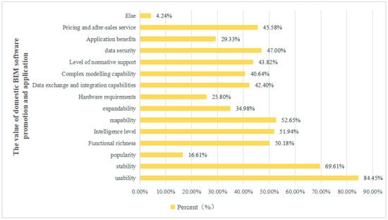 Chinese BIM software demonstrates clear advantages in development, application, and policy support. They are more tailored to the operational habits of Chinese designers and highly compatible with Chinese engineering construction processes and standards, establishing a leading position in specific fields. Additionally, Chinese BIM software is often competitively priced, providing more economical information technology choices for small and medium-sized enterprises. Furthermore, with continuous technological advancements, Chinese BIM software is increasingly sophisticated in functionality, capable of meeting localized and diversified requirements across various stages from design to construction and maintenance. Supported by policies and market promotion, Chinese BIM software has broad development prospects and application opportunities in the Chinese market. Chinese BIM software excels in “usability” and “stability”, with recognition rates of 84.45% and 69.61%, respectively. Moreover, positive evaluations have been received in aspects such as “ability to generate drawings, degree of intelligence, richness of functionalities, data security, pricing, and after-sales service”, with percentages of 52.65%, 51.94%, 50.18%, 47%, and 45.58%, respectively, as shown in Figure 13.