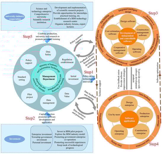 Investors (Step 2): Investors play a crucial role in promoting the marketization of BIM technology. Firstly, investors should identify and invest in promising BIM technology pilot projects, which can be new construction projects, urban infrastructure construction, or the renovation and upgrading of existing buildings []. By investing in these pilot projects, investors can provide the necessary financial support and resource assurance for the practical application of BIM technology.